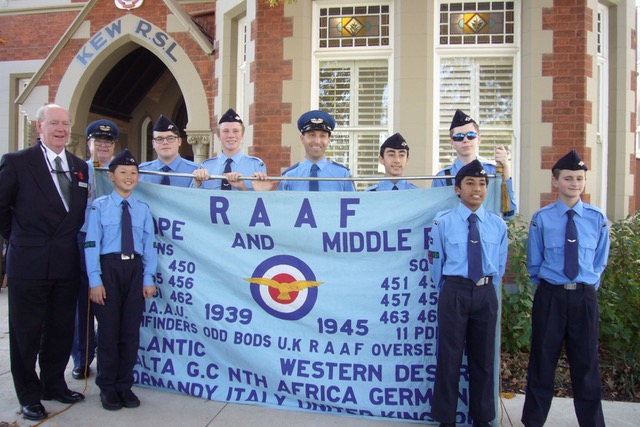 Members of the Niddrie Squadron of the Air League Cadets with Paul Dipnall outside the Kew RSL before the march to the Kew Cenotaph